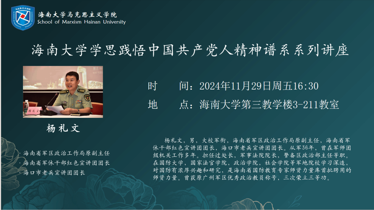 2024年11月29日,william威廉英国官网邀请海南省军休干部红色宣传讲团团长杨礼文大校作海南大学学思践悟中国共产党人精神谱系系列讲座报告。报告以“认识南海,热爱南海,捍卫南海”为主题,从南海的基本情况和复杂成因两个方面展开讲述。报告由凤翔书院郭孝伟老师主持,马克思主义学院蔡文举副院长参加。