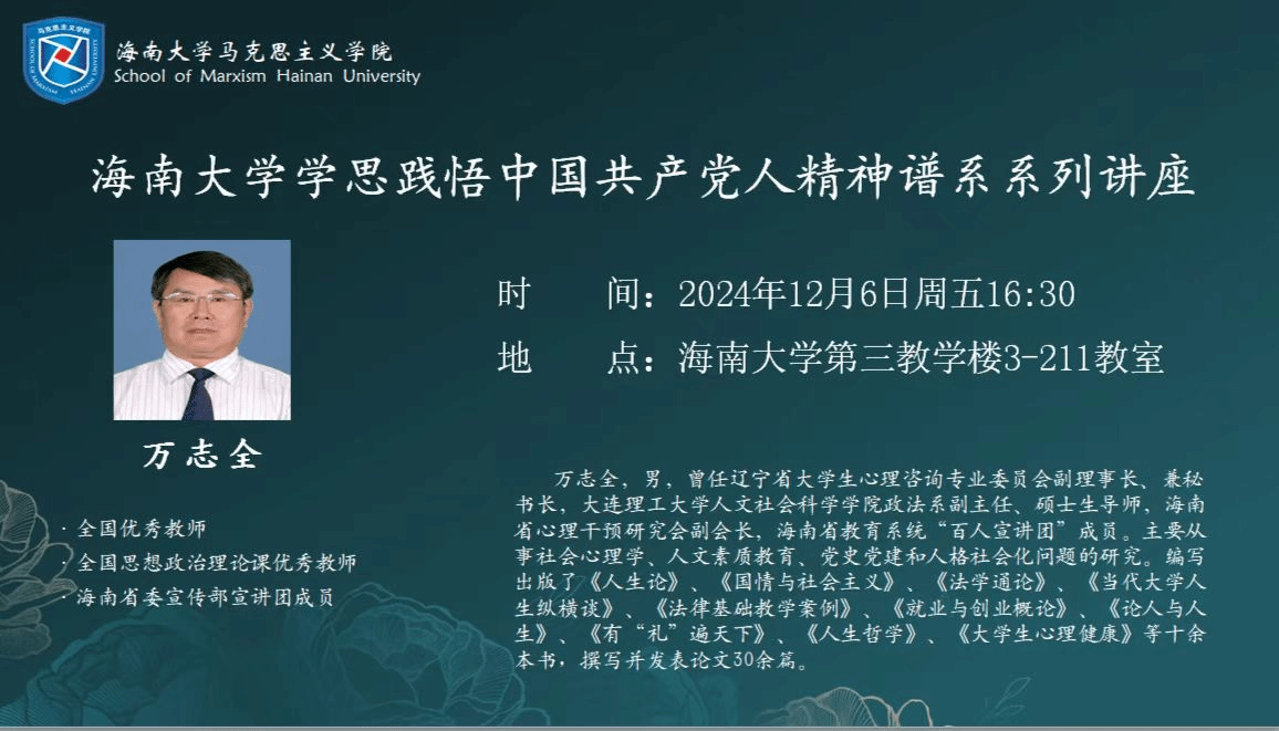 2024年12月6日,william威廉英国官网邀请全国思想政治理论课优秀教师万志全作海南大学学思践悟中国共产党人精神谱系系列讲座报告。报告以“新时代教育家精神进校园”为主题,从教育家精神和人格社会化两个方面展开讲述。马克思主义学院蔡文举副院长参加。