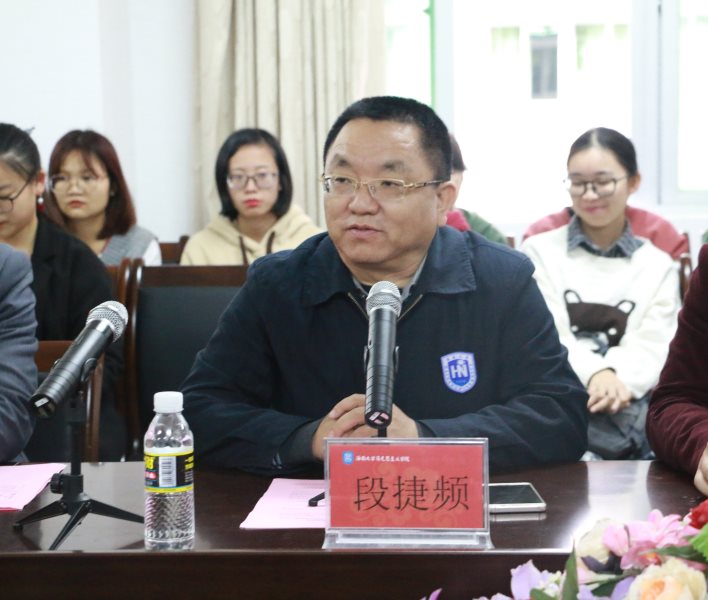 段捷频作论坛开幕致辞。他代表学院对各位校友“回家”表示热烈的欢迎和真挚的感谢。他表示,在海南大学迎来60周年校庆之际举办此次论坛意义非凡,是学院人才教育培养工程的生动展示。段捷频就近年来学校级学院各项事业发展情况及向各位校友做了简要的介绍。他指出,习近平总书记关于“要支持海南大学创建世界一流学科”的重要指示给海南大学带来了新的发展机遇,学院通过人才培养固本强基,取得了一系列丰硕成果。2018年,学院思想政治理论课“一主三辅”实践教学模式荣获国家级教学成果二等奖,实现了海南省高等教育国家级教学成果奖的历史新突破。学院通过开展各类实践活动、搭建实践平台提质增效,涂刚鹏副教授被中宣部授予“全国基层理论宣讲先进个人”荣誉称号,学院获评“全省基层理论宣讲先进集体”。张云阁院长入选全国高校思想政治理论课教师2017年度影响力人物,蒋玉教师荣获五省(区)高校思想政治理论青年教师基本功比赛二等奖,温小平博士带领的“南海记忆工作坊”团队获得高校思想政治工作精品项目,2018年本科生升学率达到42.2%,居全校第一,学院发展正在不断增速,人才培养质量不断提升。他表示,学校60周年校庆,就是为了总结过去,站在新起点上,团结凝聚包括广大校友在内的各方面力量,不忘初心、牢记使命,继续发扬“儋州立业,宝岛生根”的创业精神,恪守“海纳百川 大道致远”的校训,弘扬“自强敬业,厚德弘毅”的校风,努力学习,扎实工作,在新征程上实现新飞跃、续写新篇章、创造新辉煌。