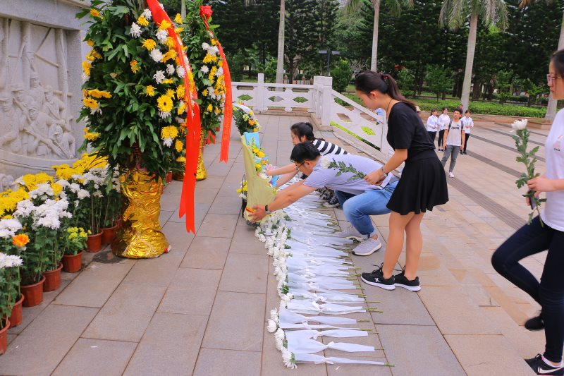 在郁郁葱葱的掩映中,在鲜红的马克思主义学院院旗和研究生、本科生党支部党旗的映衬下,解放海南岛革命烈士纪念碑显得格外庄严肃穆。党员同志、入党积极分子和共青团员代表们手持黄白菊花肃立,表达着对人民英雄的深切缅怀和崇高敬意。在巍峨耸立的英雄纪念碑前、在镌刻着20161名革命烈士英名的烈士墙下、在一座座烈士墓旁,大家用心聆听烈士英雄事迹,鞠躬鲜花,长久驻足,致垂首之哀思、燃缅怀之心香,感受先烈英魂之中蕴藏的精神之力、信仰之光,也在心中竖起一座座丰碑。