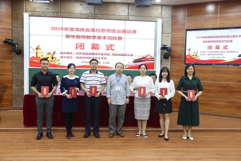 11月15日下午,2019年度海南省高校思想政治理论课青年教师教学基本功比赛在海南经贸职业技术学院闭幕。我院推荐参赛的何宏米老师荣获三等奖,林德浩、唐敏老师荣获优秀奖。本次比赛中,王善副院长担任本科组评委组长,贺尧夫老师担任高职高专组评委。