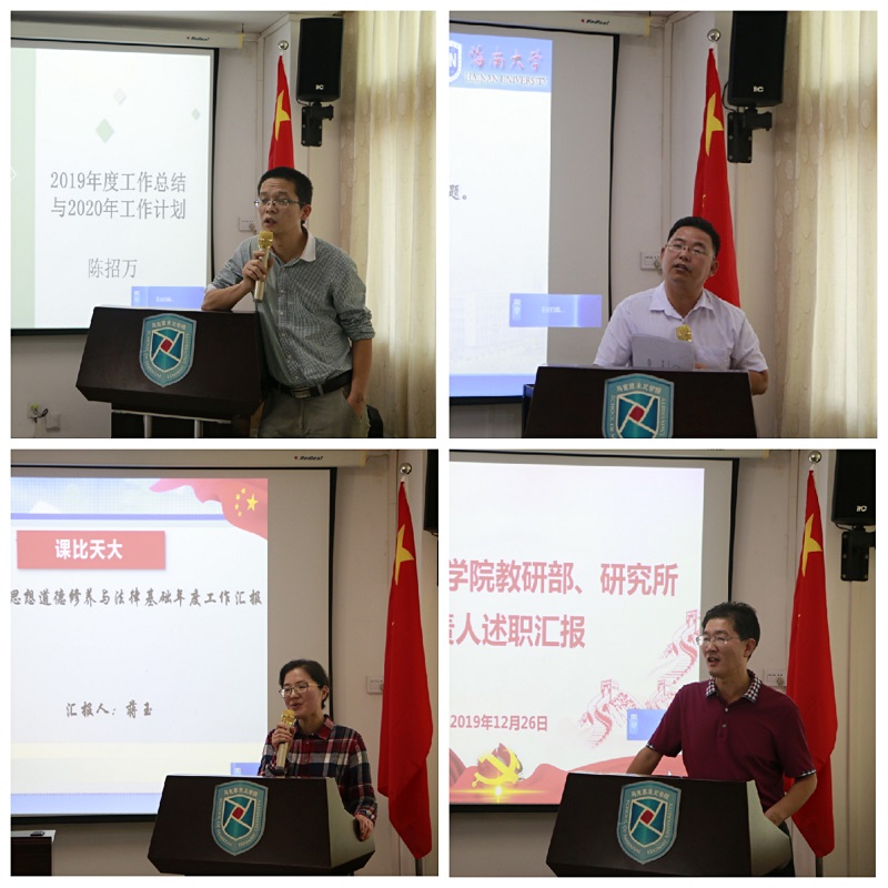 为全面总结2019学年度我院系部和研究所各项工作,查找工作中的不足,全面提高系部和研究所的工作水平。12月26日下午,马克思主义学院在社科楼A-315顺利召开马克思主义学院研究部研究所负责人述职汇报大会。海南大学教务处处长、马克思主义学院院长张云阁,学院党委书记段捷频、副书记张井富、副院长吴朝阳、王善以及全体研究部研究所负责人出席会议。大会汇报分系部和研究所两部分,分别由王善和吴朝阳主持。