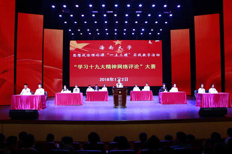 为了积极推进党的十九大精神“三进”工作,贯彻落实全国高校思想政治工作会议精神,以习近平新时代中国特色社会主义思想为指导加强大学生网络思想政治教育人才培养,海南大学于2018年1月2日下午在思源学堂大礼堂举办大学生网络评论大赛。来自全校各学院的1000多名同学现场观看比赛。
