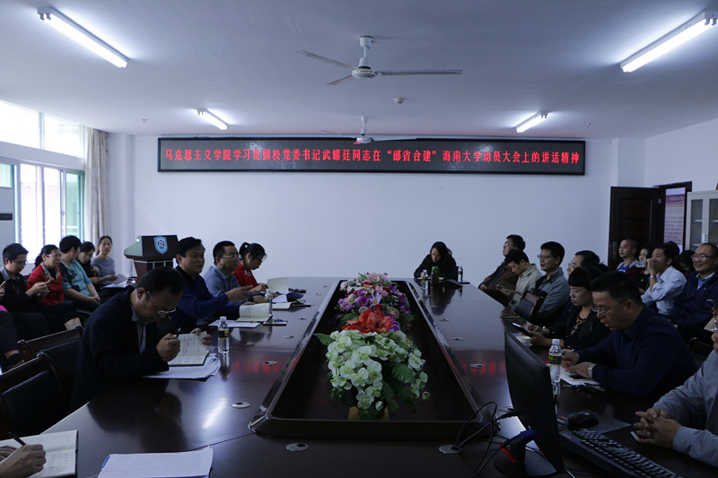 3月13日下午,马克思主义学院在社科楼311会议室召开专题会议,学习贯彻校党委书记武耀廷同志在“部省合建”海南大学动员大会上的讲话精神。学院党委书记段捷频、院长李辽宁、副院长杨娜、王善出席,全体教职工参加会议。会议由李辽宁主持。