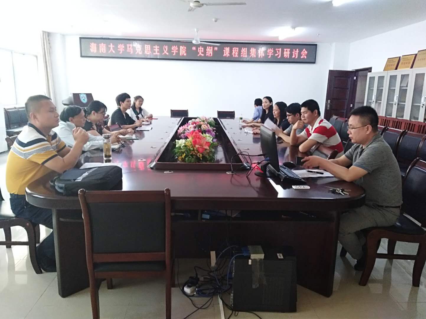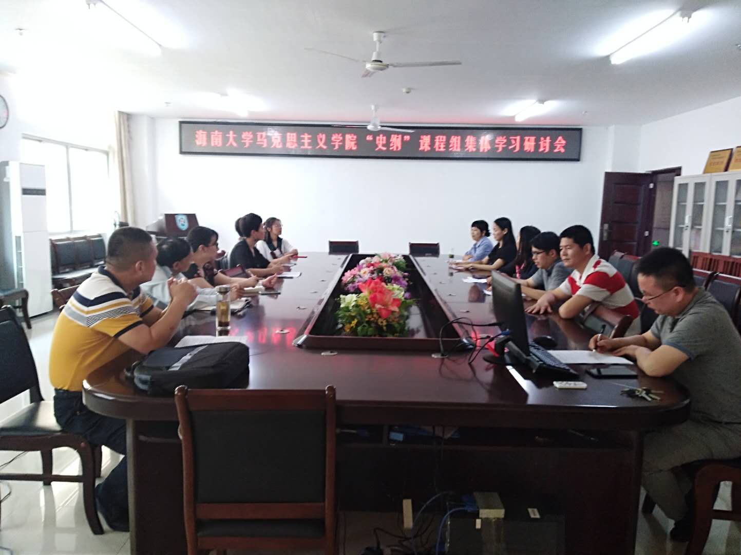首先,季笃武老师分享北京党校学习心得并介绍“纲要”课教材改革情况,接着大家围绕着季老师分享的学习成果,展开了热烈的讨论,在思想碰撞中进一步加强了对新时代中国特色社会主义理论体系的认知深度,丰富了教师们的知识结构;其次,牛平川老师介绍“纲要”课程无纸化考试的进展与学习经验,分析了无纸化考试的必要性和可行性,其他老师发表了相关的建议和意见;再次,围绕着“纲要”课实践论文统一要求的进展情况与存在的问题,老师们发表了各自的见解,在认可这种创新模式本身、肯定学生的实践论文书写以改革开放40周年、海南省建省30周年为时间断线,勾勒海南社会历史变迁必要性的同时,也指出了存在的困难,如资料、访谈、调查的地域局限性等;最后,新任课教师围绕着初入教学的相关问题展开提问探讨,在如何调动课堂气氛、教学内容的把握、教学计划的制定等一系列问题上进行了深入地学习交流,并就课堂讨论式教学模式的展开交换了意见。