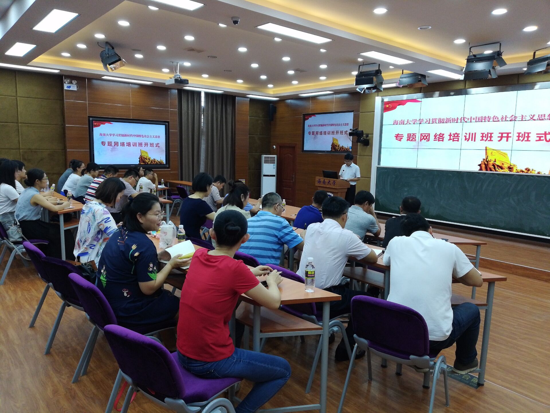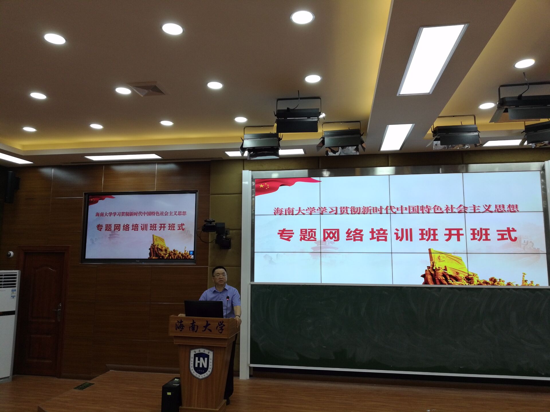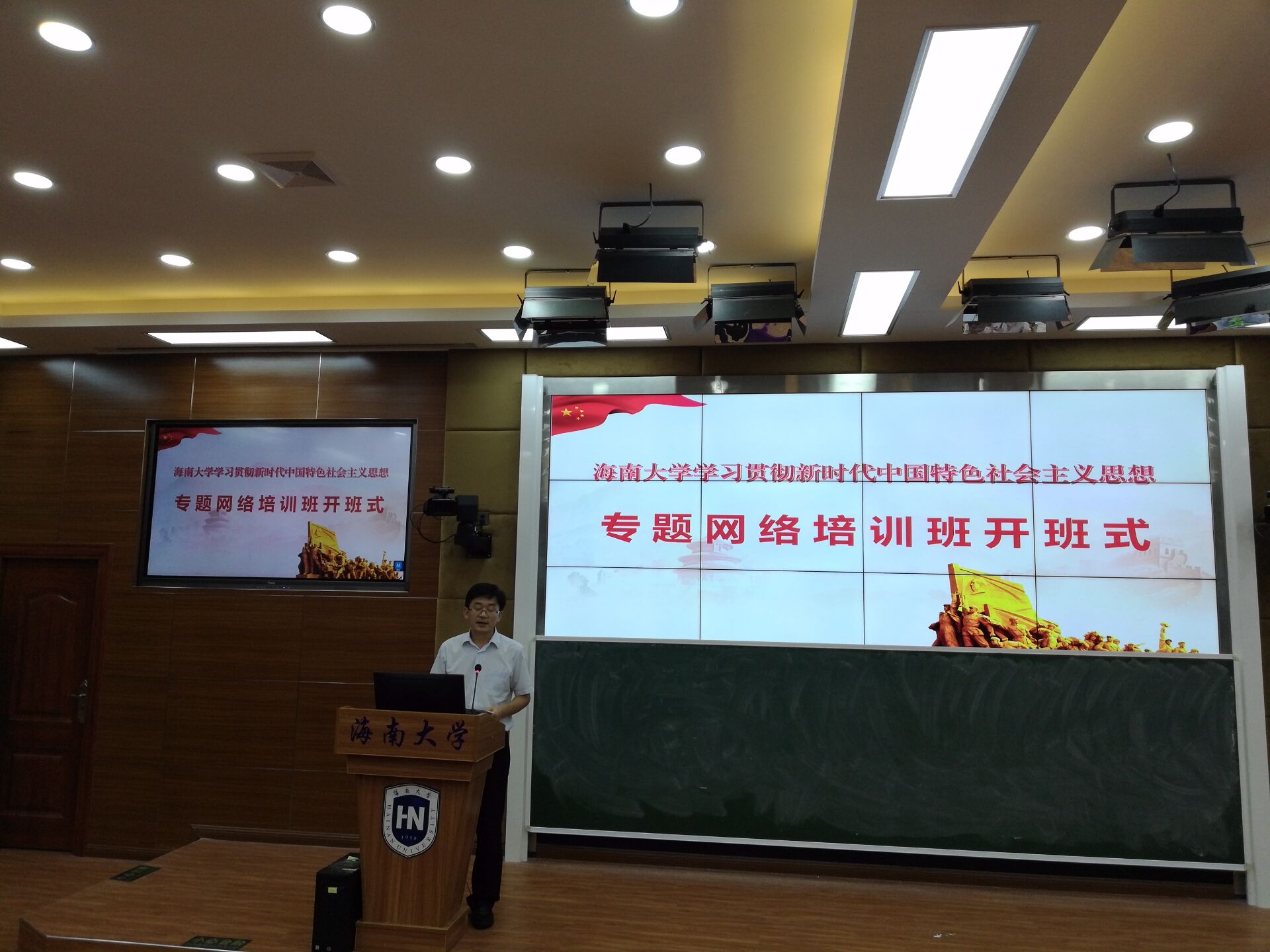 2018年6月26日下午4点半,海南大学学习贯彻习近平新时代中国特色社会主义思想专题网络培训班开班仪式在3号教学楼211教室举行。海南大学常务副书记廖清林,海南大学党委常委、宣传部部长谭勇,马克思主义学院党委书记段捷频、院长李辽宁、副书记张井富、副院长王善出席开班仪式。段捷频主持开班仪式。