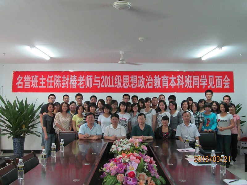 2012年3月21日下午,我院于学院三楼会议室举行名誉班主任聘任仪式暨名誉班主任与2011级思想政治教育专业本科班全体同学见面会。校党委副书记、纪委书记陈封椿老师,院长李德芳老师,书记梁谋老师,系主任王善老师,学工办主任周郭军老师,班主任陈思莲老师及2011级本科思政班全体同学参加了见面会,大会由院党委书记梁谋老师主持。