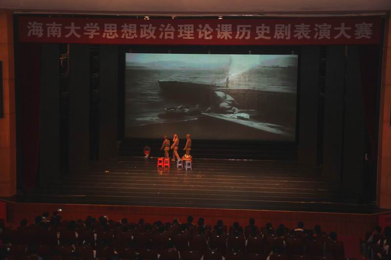 5月20日下午,海南大学思想政治理论课校园实践教学活动——历史剧表演大赛决赛在思源学堂大礼堂举行。马克思主义学院思想政治理论课一系主任陈思莲老师负责本次活动的具体策划和组织工作,此次活动共有12个历史短剧参加表演,来自全校2013级10多个班的500多名本科生观看了此次表演大赛。 本次历史剧表演大赛是我校思想政治理论课“一主三辅”之校园实践教学活动的一项内容,表演大赛以“新瓶旧酒复飘香,青春活力重飞扬”为主题,参演短剧主题鲜明,选材合理,意义深刻,内容新颖且积极向上。同学们表演形象逼真,动作到位,神态自然大方。演出过程中剧情衔接良好,整体效果佳,表现出良好的团队协作能力。 历史剧表演比赛,以独特的形式来展现历史,通过生动的现实版画面,让同学们重温历史场景,充分展现我校大学生的青春与活力,为多才多艺的同学们提供一个展示自我的平台。同时,也丰富了同学们的业余生活,使历史与生活水乳交融。表演过程中,评委们对每一组同学的表演都做了精彩细致的点评,使同学们对自己的表演和历史事件有了更加正确和完整的认识。 历史剧表演持续了两个多小时,同学们的精彩表演不时赢得台下观众的阵阵掌声。