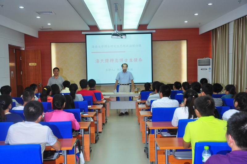 9月18日下午,校党委书记刘康德教授走上研究生思想政治理论课讲坛,为我校2014级全体博士研究生作题为“海大精神与博士生使命”的讲座。《中国马克思主义与当代》课程负责人张云阁教授主持讲座。校党委办公室主任梁谋,马克思主义学院党委书记段捷频、副院长杨娜旁听了讲座。 刘康德教授采用校史馆现场解说、主题演讲和师生互动相结合的授课形式,从海南大学的历史沿革讲起,向同学们讲解原两校师生在推进学校发展过程中传承下来的主要精神;结合中国传统文化和新海南大学的建设发展,向同学们诠释了“海纳百川、大道致远”的校训和“自强敬业、厚德弘毅”的校风,进而向同学们全方位、深层次地解读海南大学精神。 刘康德教授指出,博士研究生接受的是大学最高层次的学历教育,要清楚自己的角色定位,作为精英教育对象,更要担负起自己所应承担的使命,努力成为德才兼备的社会主义建设者和可靠接班人。他强调,全力提升学生的社会竞争力和提升教师的社会影响力是学校的办学理念,他希望全体博士研究生能够在接下来三年的时间里锻炼自己的思维力、学习力、亲和力、意志力、适应力、实践力和创新力等能力,以全面提升自己的社会竞争力,促使提高学校的科技创新能力以及人才培养质量,促进内涵式发展,为建设全国百强高校贡献一份力量。 在互动交流环节,同学们认为,刘康德书记为2014级博士生上第一课,体现了校党委和校领导对研究生教育的高度重视,表达了一个师者和长者对莘莘学子的深切关怀和殷切希望,听了刘书记的讲课,很受教育、很受鼓舞,同时也增强了荣誉感、使命感和责任感。同学们表示,将传承和弘扬海大精神,努力提升自己的社会竞争力,承担起博士生应有的使命和责任,给学校和自己交出一份满意的答卷。