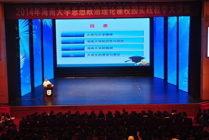 10月28日下午,本学年作为海南大学“一主三辅”思想政治理论课实践教学活动之一的校园实践教学大讲堂在思源学堂隆重开讲,校党委书记刘康德教授再次走上大讲堂,以“大学精神与大学生使命”为主题为2014级本科新生作报告。来自全校各学院的上千名本科新生参加报告会。马克思主义学院副院长张云阁教授主持报告会。