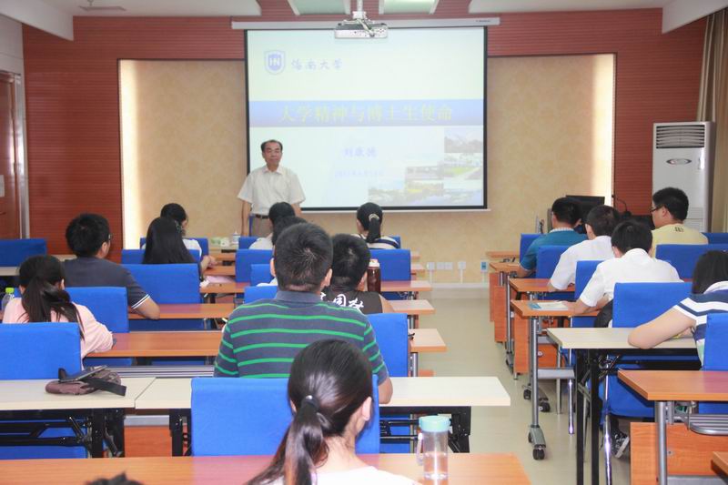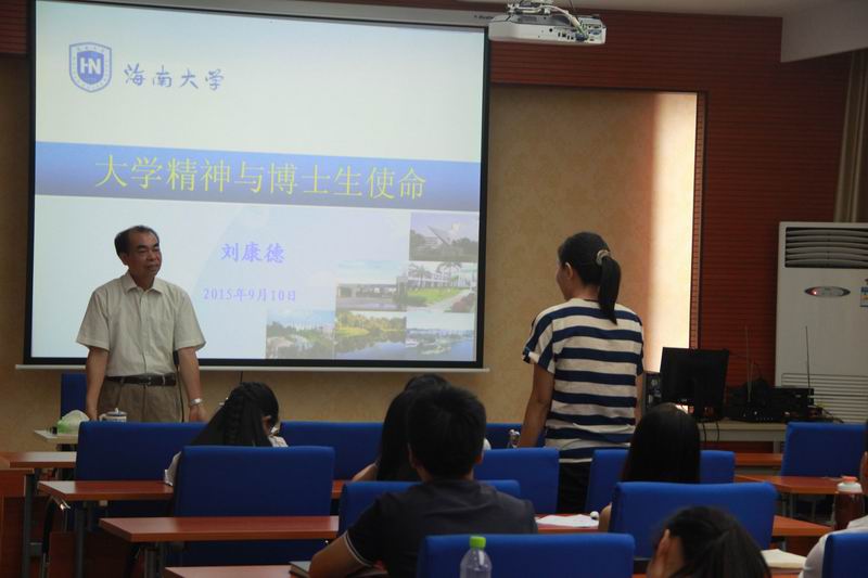 9月10号下午,正值教师节这个特别的日子里,校党委书记刘康德再次走上思想政治理论课讲坛,为我校2015级全体博士生作题为“大学精神与博士生使命”的讲座。《中国马克思主义与当代》课程负责人李辽宁教授主持讲座。马克思主义学院院长李德芳、院党委书记段捷频、副院长杨娜旁听了讲座。 刘康德教授首先带领博士生们参观校史馆,采用生动直观的教学方式,将海南大学的历史沿革娓娓道来,帮助同学们领悟海南大学建校几十年依然坚守的大学精神和使命。他向同学们讲述海南大学近几年来的发展现状,介绍了海南大学近几年的建设成果,同时对在座的同学们寄予厚望。刘康德教授在校史馆的讲解始终贯穿“海纳百川,大道致远”的校训和“自强不息,厚德载物”的校风这一条主线,旨在让同学们谨记校训校风,弘扬海大精神。 参观完校史馆,刘康德教授带领同学们回到课堂,进一步深入探讨博士生的使命和定位。他指出,博士是大学生中的精英,接受的是最高层次的教育,重点在于科研素质和创新能力的培养和提高,因此更要清楚自己的定位和使命。他希望,同学们按照学校所提出的“两个面向”和“两个力”的战略目标,秉承和弘扬海大精神,积极开拓创新,为把海南大学建设成为全国百强高校贡献一份力量。 在最后的交流互动环节,刘康德教授的精彩解答获得了同学们的阵阵掌声。听完博士生涯的第一课之后,同学们都很受教育和鼓舞,感觉到了自己身上沉甸甸的使命和责任,同时更增添了一份为海大增光为祖国增光的自豪感和荣誉感。同学们纷纷表示,将努力培养自己的社会竞争力,秉承海南大学的精神,肩负起博士生的重要使命,为海南大学和自己的明天绘一幅精彩的画图。