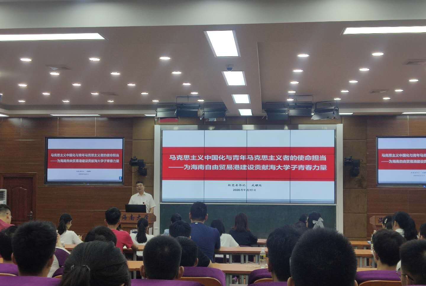 9月22号下午,海南大学党委书记武耀廷走进“开学第一课”,在3号教学楼211教室为马克思主义学院2020级全体本科、研究生新生和部分学生骨干、思政课教师讲授“马克思主义中国化与青年马克思主义者的使命担当——为海南自由贸易港建设贡献海大学子青春力量”。