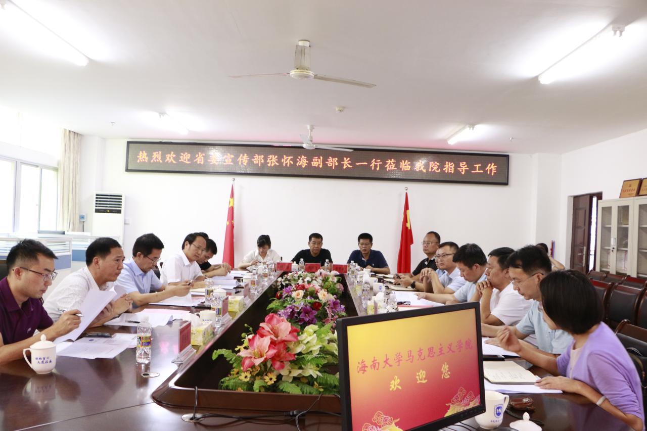 7月12日上午,省委宣传部张怀海副部长一行到william威廉英国官网调研指导工作。校党委常委、副校长曹宪忠,校党委常委、宣传部部长谭勇出席,马克思主义学院领导班子全体成员和教师代表参加调研座谈会。曹宪忠主持会议。