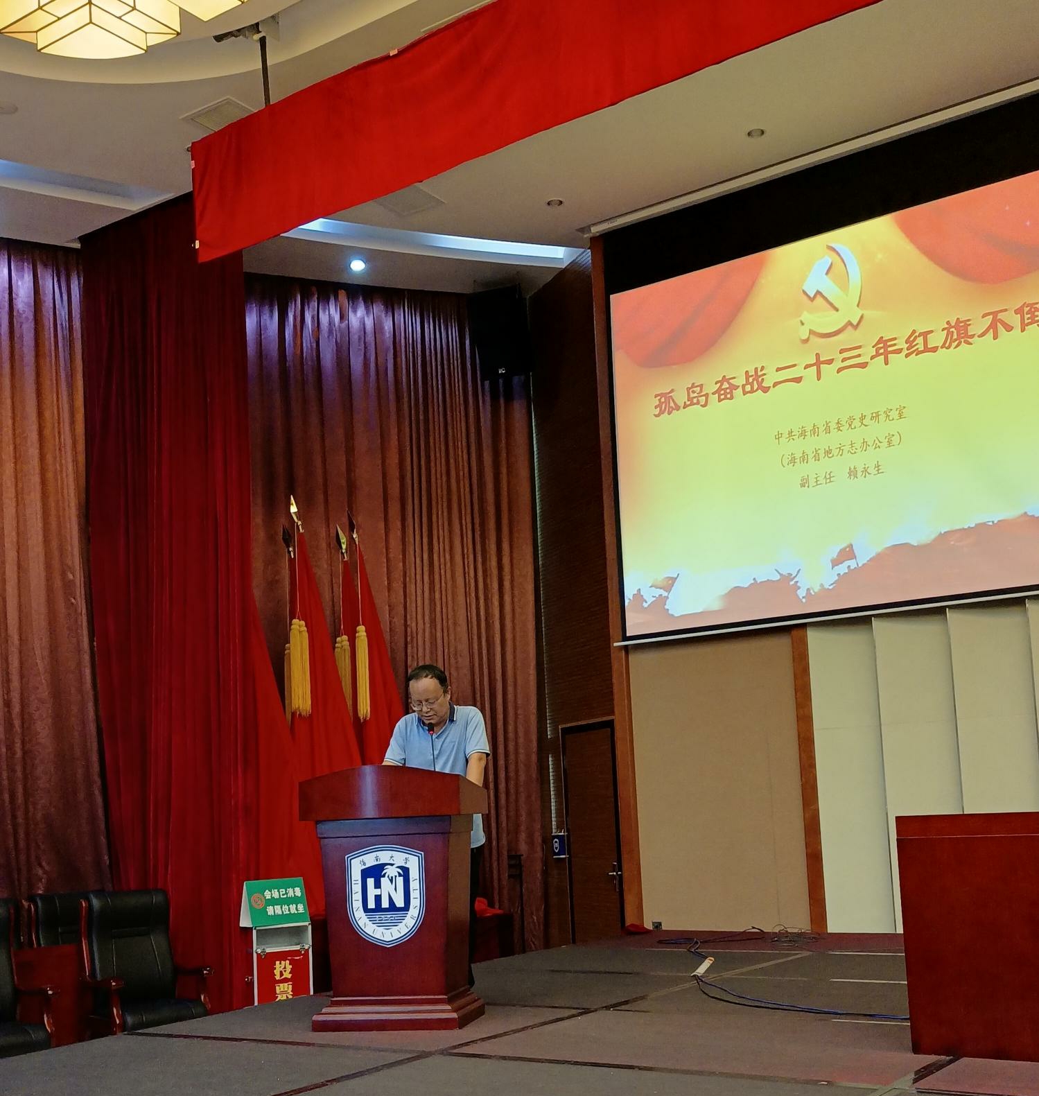 报告会上,赖永生副主任从什么是“二十三年红旗不倒”、为什么能“二十三年红旗不倒”、“二十三年红旗不倒”精神的现实启示等方面,系统讲述了琼崖革命“二十三年红旗不倒”的光辉历史,阐明了“二十三年红旗不倒”的基本含义、精神内涵和现实意义。他强调了,“二十三年红旗不倒”的精神内涵是琼崖共产党人百折不挠,在海南进行艰苦卓绝奋斗形成的革命精神,而这种精神主要体现在坚定信念,勇往直前;实事求是,开拓奋进;为了人民,依靠人民;勇于牺牲,无私奉献。为此,他希望我校师生能够做到学史明理、学史增信、学史崇德、学史力行,深入把握“二十三年红旗不倒”精神的丰富内涵,站在全面深化改革开放新的历史起点,自觉地肩负起建设海南自由贸易港的历史使命。