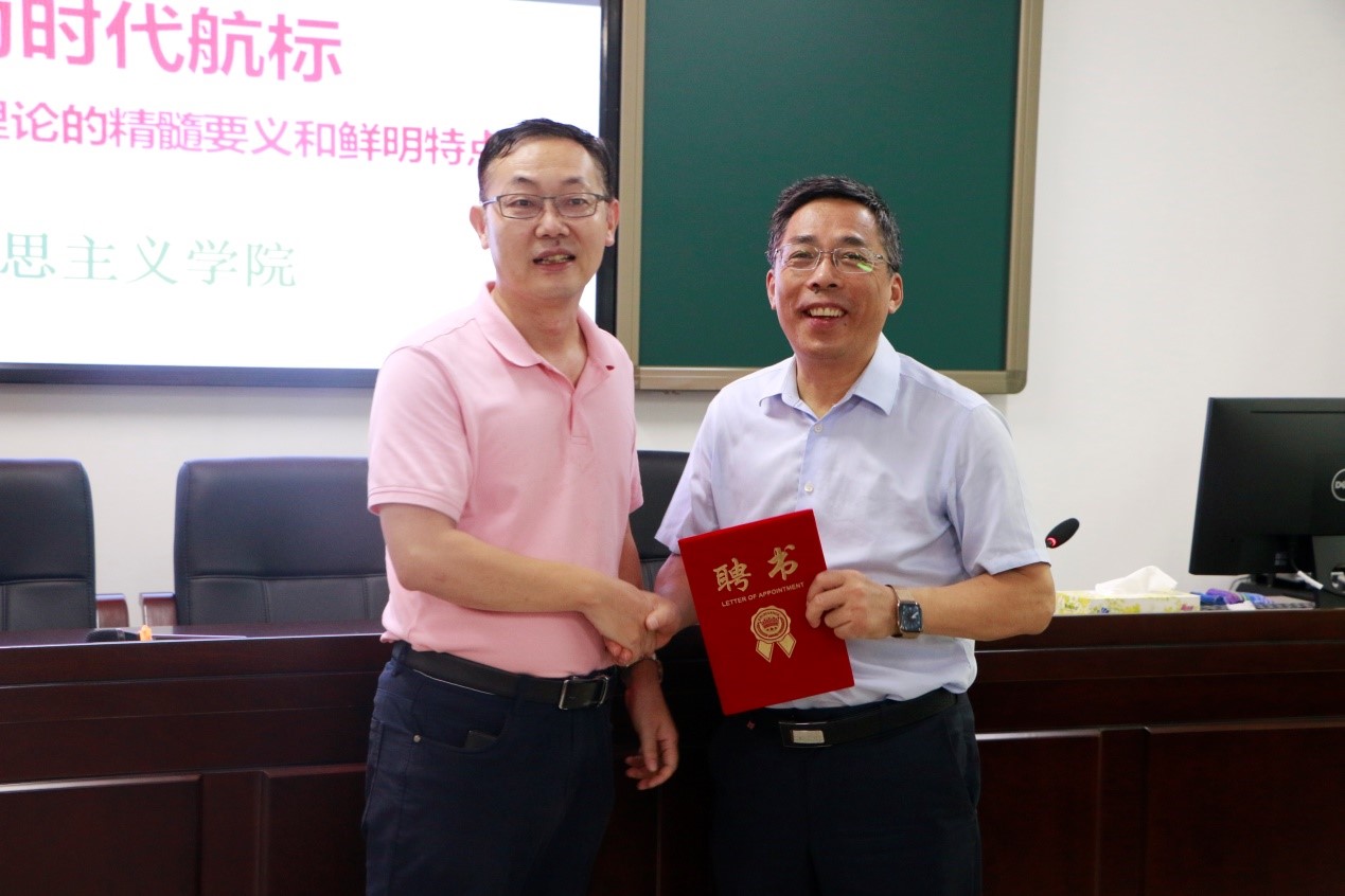 9月29日上午,马克思主义学院2021-2022学年冬季小学期系列讲堂第一讲在社科楼A309举行。南京师范大学王永贵教授应邀为我院学生作以“习近平总书记文化强国理论及鲜明特点”为主题的学术报告,副院长吴朝阳出席报告会并为王永贵教授颁发海南大学“冬季小学期授课外聘专家”证书。