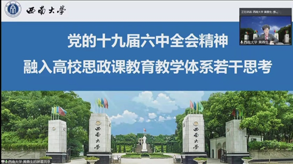 国务院学位委员会学科评议组马克思主义理论学科召集人、教育部思想政治理论课教学指导委员会咨询委员、西南大学原党委书记黄蓉生教授,中央马工程首席专家、华南师范大学马克思主义学院院长陈金龙教授应邀分别做了题为“党的十九届六中全会精神融入高校思政课教育教学体系若干思考”“第三个历史决议的叙史方法”的主旨报告。