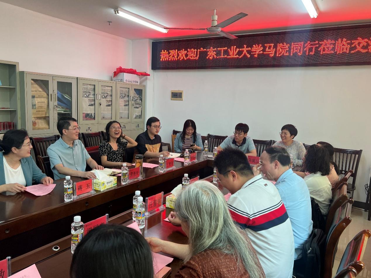 4月18日下午,广东工业大学思想道德与法治教研室党支部书记黄成忠一行11人在社科楼A-308与我院交流互动。我院副院长杨娜、教学委员会副主任贺尧夫、思想道德与法治教研室主任蒋玉等出席会议。会议由贺尧夫主任主持。