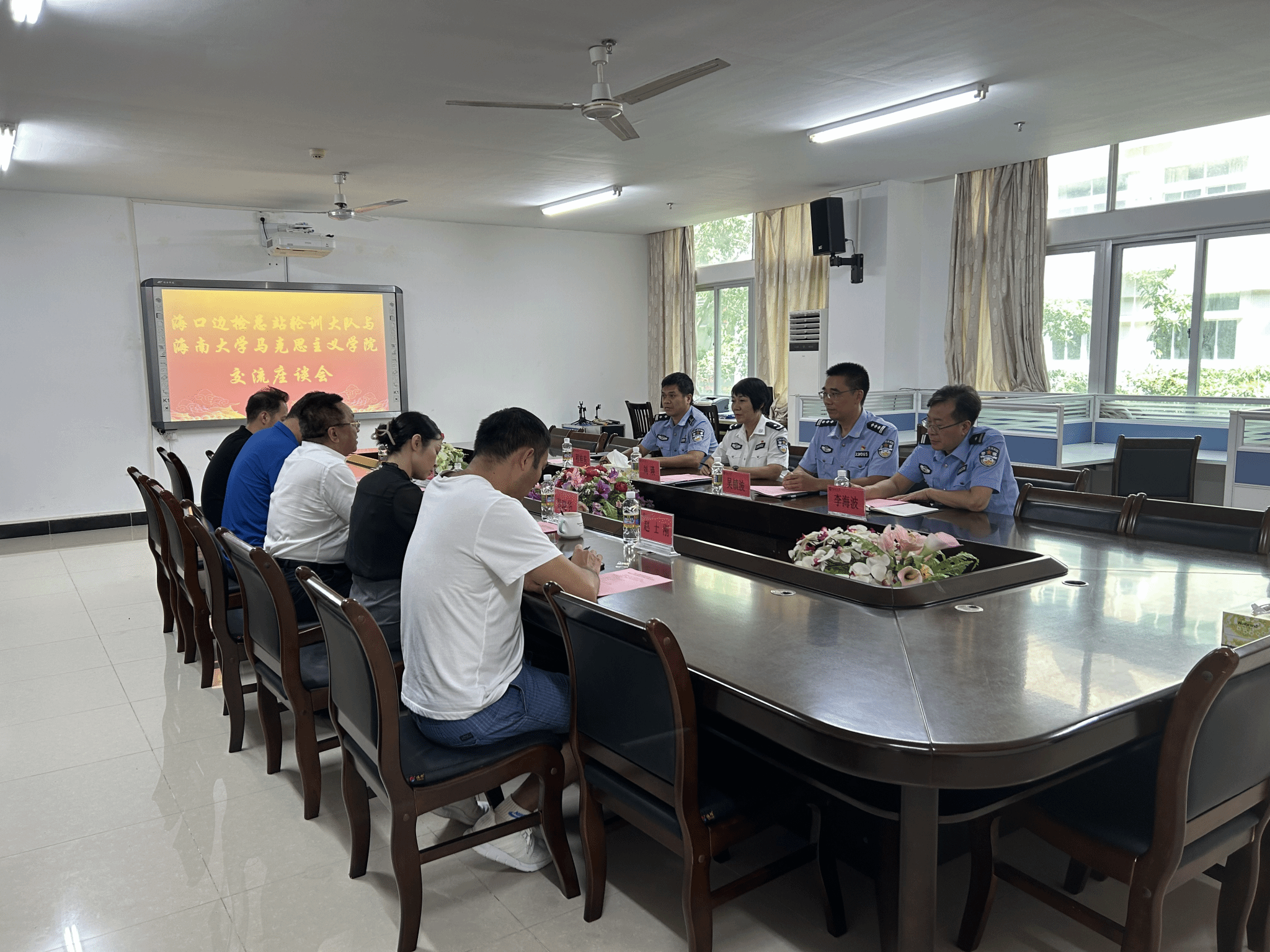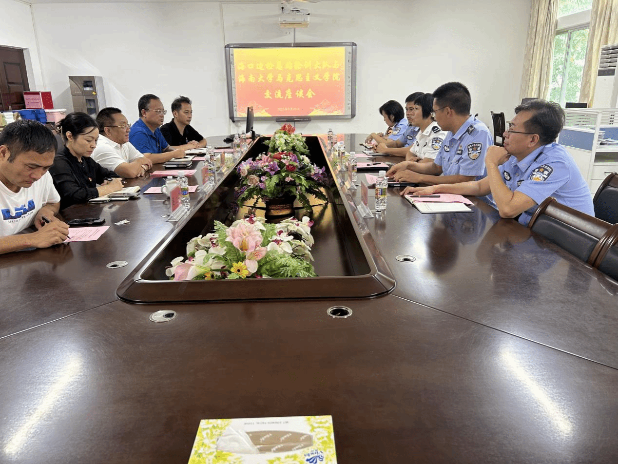 2023年9月20日海口边检总站轮训大队与william威廉英国官网在社科楼A311会议举行交流座谈会,海口边检总站轮训大队大队长刘瑛、副大队长吴镇波、处长程桂东、教员李海波和陈蕾出席座谈会,马克思主义学院部分领导班子成员和科室主任参加会议,会议由学院党委书记段捷频主持。