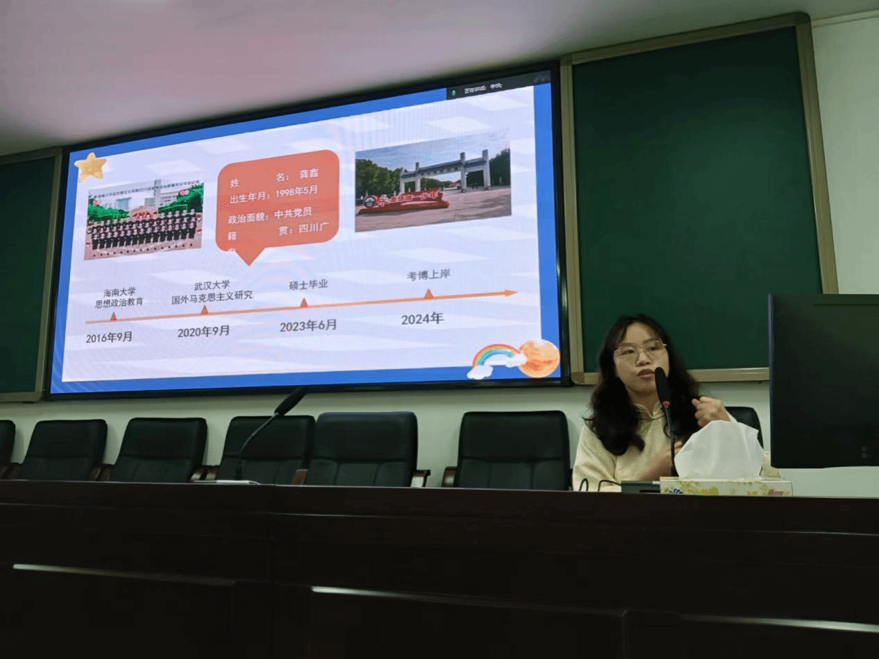 叶子维学长就“校园生活追忆与感悟”“考研考博形势分析”两方面进行了分享,深情回忆了在海大马院四年的美好生活,并详细地就马理论学科考研、读博的形势进行了分析,介绍了武大马院目前的考研情况,鼓励大家思考当下、规划未来。