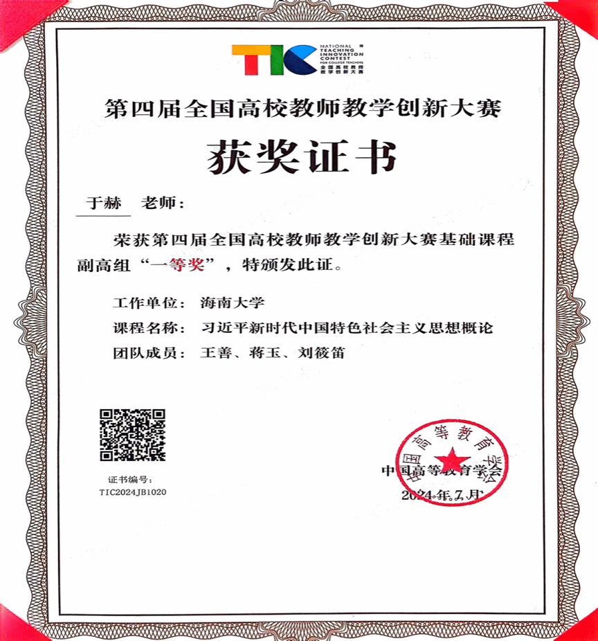 我院于赫老师代表海南省与来自全国多所高校的教师进行了同场竞技,主讲了《习近平新时代中国特色社会主义思想概论》,凭借扎实的教学基本功和良好的综合素养,在竞争中脱颖而出,荣获基础课程副高组一等奖,取得了我校也是海南省在全国高校教师教学创新大赛中的历史性突破,展示了我院思政课教师的专业素养、教学水平和精神风貌。