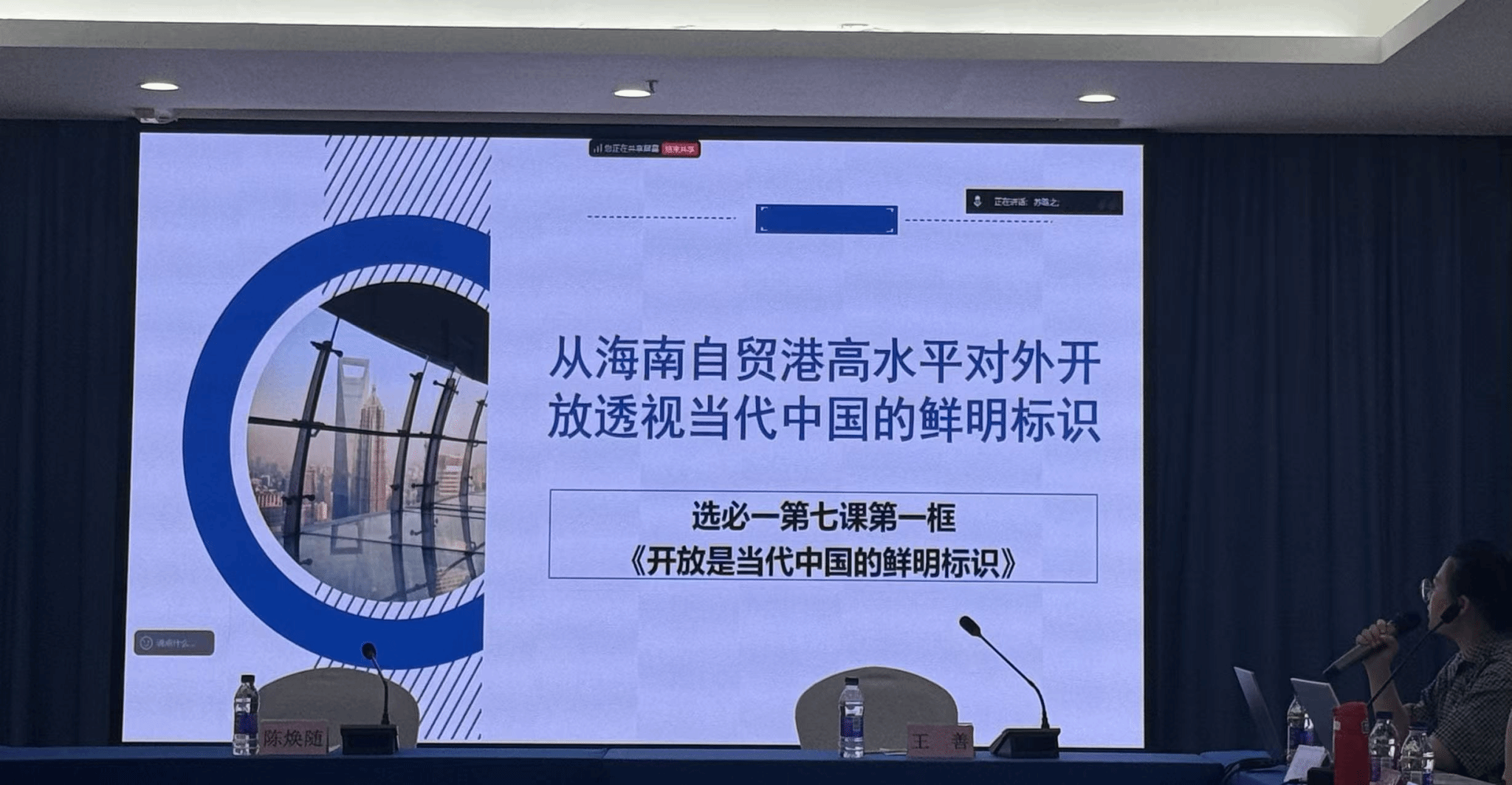 来自海南大学等四位老师围绕“高水平对外开放在海南自贸港的创新实践”进行了“同题异构”教学展示。上海师范大学附属儋州实验学校的吴丽贞老师通过与AI小椰对话形式,让课堂在生动活泼的氛围中实现了知识的传递;东方市铁路中学的杨宗舒老师用“知信行”的理念践行国家战略到个人行动的落实;临高县临高中学的陈莹老师用“我与自贸港”,从小案例到海南上升至国家,诉说了不是“追随者”,而应是“引领者”的青年责任;海南大学的安睿颖老师以“是什么、为什么、怎么做”贯穿,“国际循环和国内循环”的供需为理论抓手,用“围棋布局”思维,讲述了国家战略到海南实践的制度指引与实践创新之路。